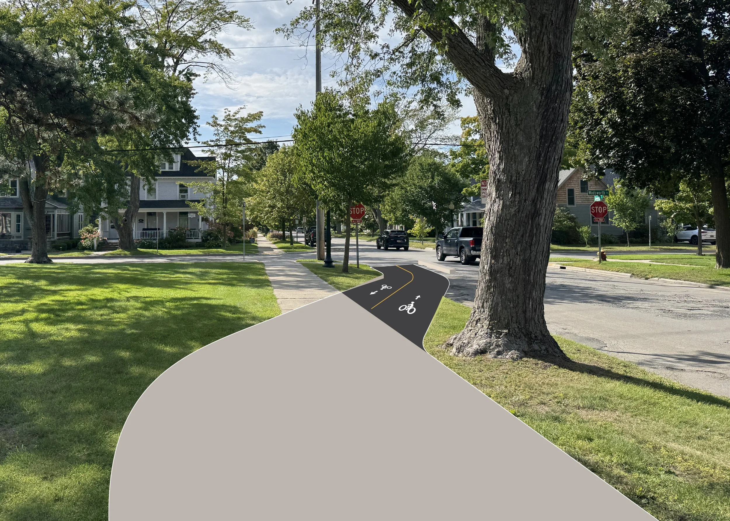 The conceptual design creates bike lanes for both directions while maintaining the westbound vehicle travel lane and the on-street parking on the north side of the street. The bike lanes merge into a shared use path along the Central Grade School to allow for a designated drop off/pick up zone.